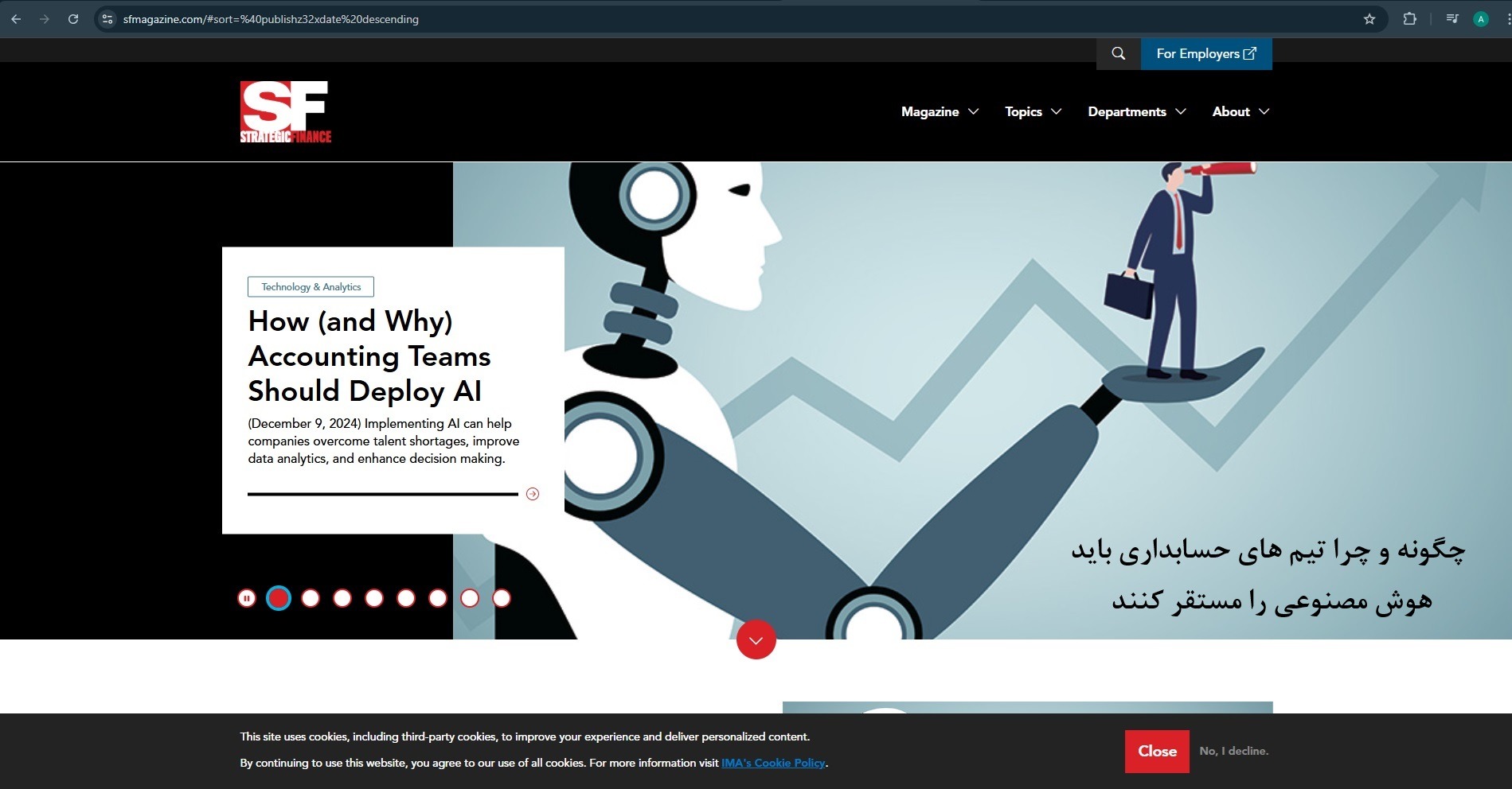 وبسایت مجله SFMAGAZINE مرجع بسیار خوبی برای مطالعه و تحقیق در حوزه مباحث روز حسابداری است. این مجله بعنوان پیشتاز و برنده جوایز IMA( موسسه حسابداران مدیریت) شناخته می شود. محتوای مطالب این مجله برای رشد شخصی و حرفه ای بسیار کاربردی می باشد. این مجله به طور مداوم توسط اعضای IMA به عنوان یکی از مفیدترین و ارزشمندترین مزایای عضویت در این نهاد ارزیابی میشود.با ارائه مقالات و تحلیلهای عمیق، مجله مالی استراتژیک به حرفهایهای مالی کمک میکند تا تصمیمات بهتری بگیرند، مهارتهای خود را بهبود بخشند و در حرفه خود موفقتر شوند. با تمرکز بر موضوعات مهم و مرتبط با صنعت، این مجله یک ابزار ضروری برای هر کسی است که به دنبال پیشرفت در حوزه مالی و حسابداری است. جهت مراجعه به وبسایت مجله مالی استراتژیک بر روی تصویر زیر کلیک کنید.